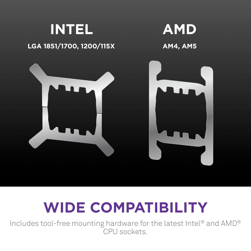 - Легко устанавливается с помощью предварительно нанесенной термопасты, одного кабеля и монтажных кронштейнов для новейших процессорных сокетов Intel и AMD, не требующих инструментов.